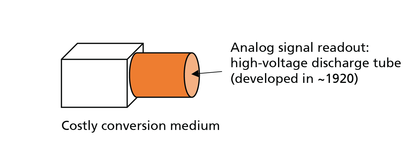 Handcrafted glass PMTs are used to convert light into electrical signals. Such tubes are fragile, have high quality variability and require high-voltage for operation. There are only few tube manufacturers worldwide.